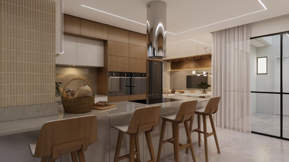 Térreo: área integrada com Sala de estar cozinha e espaço Gourmet com churrasqueira ; Lavabo; Lavanderia.
